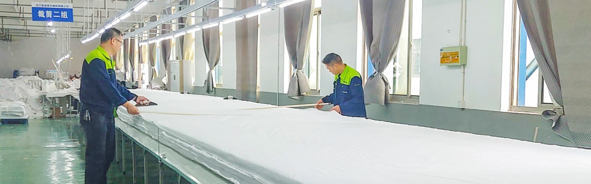 Laminated, Quilted, Waterproof fabrics designed and manufactured on-site by Zhejiang Ju Miao.
